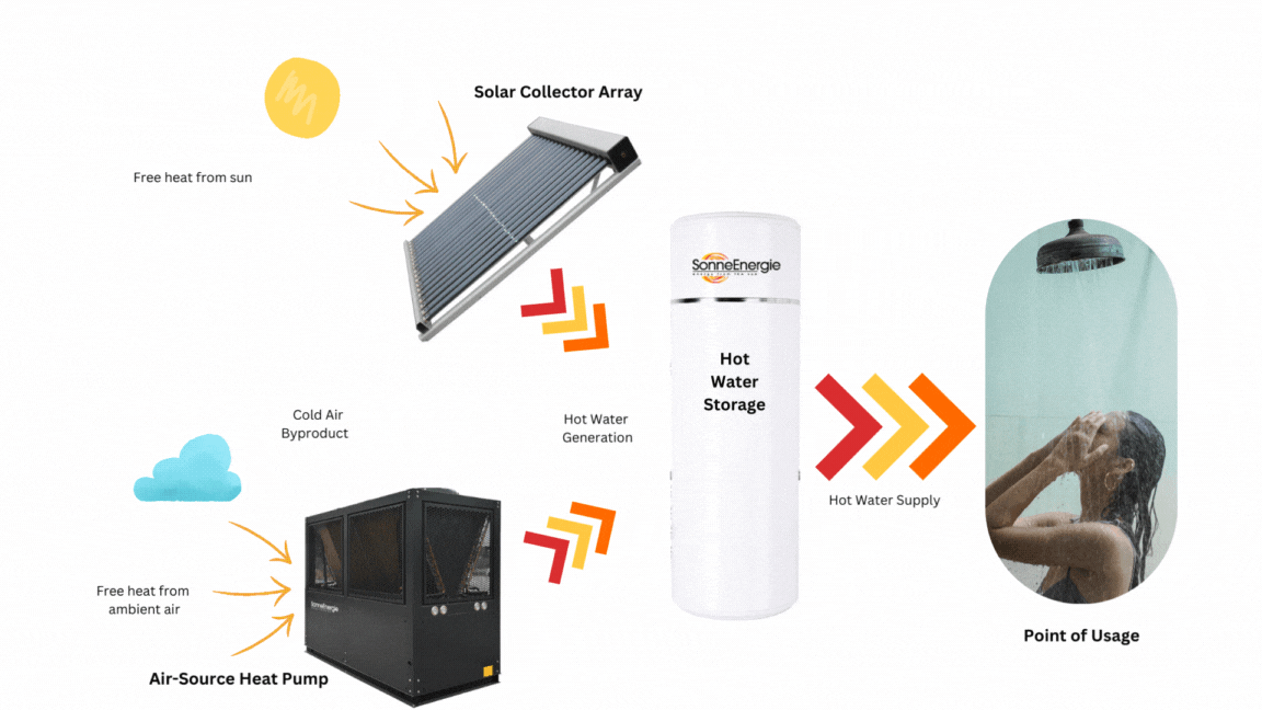 Our Solar / Heat Pump Hybrid Water Heating System is capable of absorbing free heat from both the sun and the ambient air.